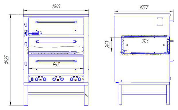 Расположение органов управления относительно пекарных камер: снизу